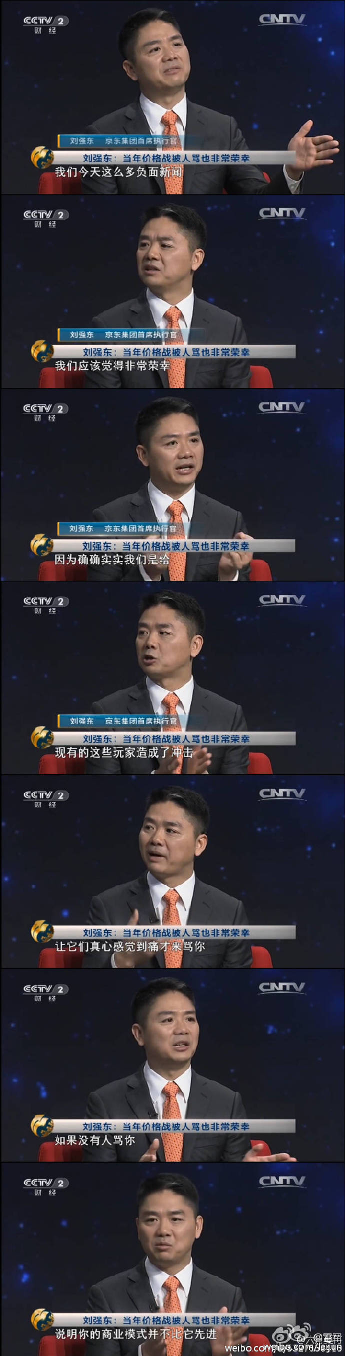 京东曾因价格战被骂,刘强东在接受央视采访时解释,当年价格战被人骂也非常荣幸,我们今天这么多负面新闻,是因为我们的的确确给现有的玩家造成了冲击,让他们真心感到痛才会骂你;如果没有人骂你,证明你的商业模式并不比他的先进。