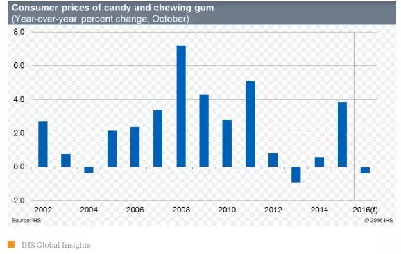 今年万圣节糖果消费的增加与往年价格上涨不同。据IHS报告,由于贸易政策的变化和对非转基因原糖的需求提升等原因,2016年糖果的价格将会下降0.4%。很显然,今年糖果的销量将会大涨。
