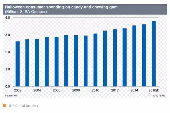IHS发布报告称,今年万圣节糖果消费将达到38亿美元,与去年同期相比增长5.5%。每户平均消费30.6美元。