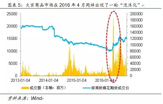 到2016年4月,股票市场和债券市场都已经“水位不低”,资金又开始涌向另一类金融资产——大宗商品市场,虽然这一市场投资门槛较高,但同样出现过一轮“泡沫化”。