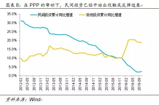 此外,流动性并不会永远在各种金融资产之间挪移,可能开始逐渐进入实体经济。只要资金没有离开银行体系,银行在资金成本的压力下就需要寻找资金的去处。对于银行而言,如果整体货币不收紧,房贷受阻之后的下一个信贷投放方向是什么?同下半年财政刺激的大方向相契合的,基建类贷款可能成为一个好选择。而中国政府当前热推的PPP可能正在发挥作用,通过财政资金撬动民间投资,民间投资已经开始出现“触底反弹”迹象。如果一旦经济开始企稳,能够提供更高的资金回报率(ROE),资金会逐渐从金融资产中撤出,进入实体经济。