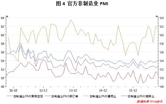 10月官方非制造业PMI 录得54,较9月微升0.3个百分点;非制造业新订单指数50.9,较上月小幅下滑0.5个百分点,但仍位于荣枯线之上;服务业PMI 录得52.6,较上月提高0.3个百分点,建筑业PMI为61.8,较上月小幅下滑0.1个百分点,为2015年7月以来的次高点(图4)。新订单指数和业务活动预期指数虽然较上月均有小幅下滑,但仍处于景气区间,为非制造业平稳发展提供持续动能和信心,促进非制造业继续平稳发展。四季度积极财政政策以及PPP加码,基建投资进程稳步推进,或将对建筑业生产活动持续产生拉动效应。