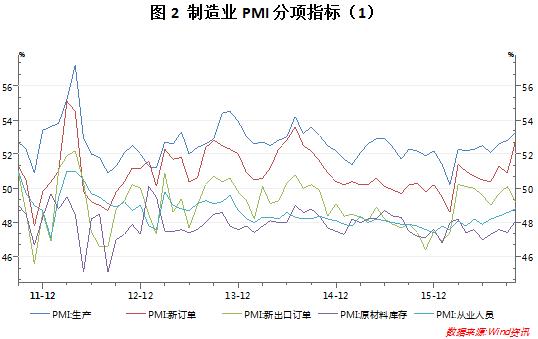 从分项指标来看,生产指数录得2014年11月以来的高点53.3,连续4个月上升;新订单指数52.8,较上月大幅提高1.9个百分点,创2014年10月以来新高,新出口订单指数再次回落至荣枯线下为49.2,较上月回落0.9个百分点;9月从业人员指数和原材料库存指数虽处于荣枯线下,但均较上月有所上升。生产指数和新订单指数连续处于扩张区间,显示制造业生产延续8月以来的回暖态势,而新出口订单重回荣枯线之下,说明新订单指数上涨的主要原因在内需回暖(见图2)。
