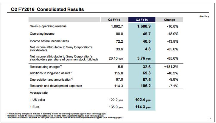 据彭博报道,索尼周二发布了该公司2016财年第二财季财报。财报显示,受日元汇率走强及出售电池业务带来资产减损等多方因素的影响,索尼当季净利润同比下滑了近86%。