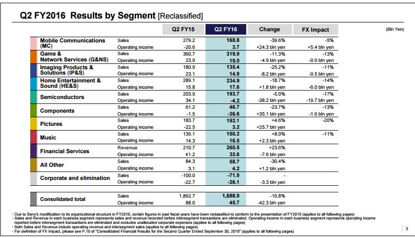 根据财报,索尼游戏部门营收319.9亿日元(31.67亿美元),下滑了11.3%。索尼在财报中解释,这主要是因为汇率变动和PS4硬件降价,但是被PS4的软件销售增长抵消了。虽然索尼的VR头显和PS4升级版在那时还没发布,但根据财报,如果去除掉汇率影响,该部门的业务的业务实际上呈增长趋势(2%)。游戏业务的增长抵消了图像传感器部门的损失。受四月发生的地震的影响,相关相机芯片暂时停产了。