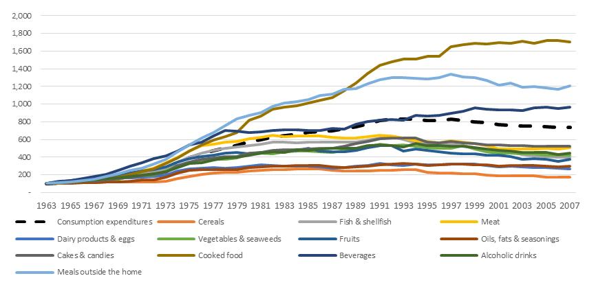 但是到了1980年后的这代人,连在家做饭的时间都没有了,自然买凉拌菜加菜的需求也就没有了,于是这些公司只能转型到外卖市场。所以有些创业者讲做厨具,我觉得是很需要勇气和耐心的,因为未来厨房的使用频率一定干不过卧室,你做厨具一定干不过做家纺的。这种人口变迁来带的消费方式的转变并不是中国独有的,基本上每个国家都经历了一样的事情,比如日本: