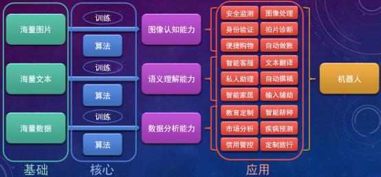 由于人工智能应用领域广泛,因此按照当前人工智能实现的基本功能来分类介绍,即四部分:图像认知能力、语音语义理解能力、数据分析能力、整合多种能力的机器人,一方面这样分配比较均衡,另一方面这样跟人类处理信息的模块能对应上关系,即人类处理信息时输入主要靠的是视觉图像和听觉文字,思考主要靠分析。