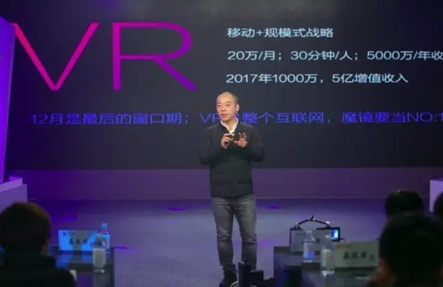从现在开始往后,大概最多有12个月是VR竞争的窗口期,如果这12个月还没有一个明确大的竞争对手对我们产生正面的进攻,12个月之后,VR竞争窗口可能就关闭掉了。而且VR虚拟现实不是一个简单的娱乐平台,它是整个互联网,涉及到社交、电商,包括过去的资讯、汽车、房产、游戏,全部都有涉及。大家都知道,我们整个互联网竞争的是摆在桌面上的电脑、笔记本、拿在手上的手机,再向下一步,屏幕就是放在你的眼睛上,现在大家抢的就是眼睛上的这个位置,下一个互联网平台。魔镜希望这12个月的窗口期安静度过,它就是互联网的第一。我说暴风魔镜这家公司未来的想象空间比暴风集团整个都要大。