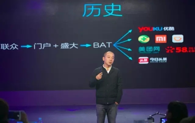 当我们洞察的时候,其实我们是回顾历史来看的。我来讲互联网的历史,人人都可以看,我们拿出来总结一下。真正开始有互联网,以前卖电脑,有互联网大概就是90年代末,99年、2000年,当时有一个对互联网贡献最大的公司叫联众,很多人因为联众才开始上网。联众头一年最大的收入是中国电信给他们钱,因为联众的存在,导致用户上网花流量,所以运营商要给他钱。他们的创始人鲍岳桥,我觉得他们太重要了,他们是中国互联网的奠基人,大家因为想下个棋,打个牌开始上网,拨号上网。我相信你们这个岁数肯定很多人拨号过,老断,但是老拨,疯了一样的上这个网,但是在2000年左右,开始有门户,中国曾经的互联网首富是陈天桥的盛大,是游戏公司,再往后就终于出现了让大家害怕得不得了的,也无法撼动的BAT出现了,到今天互联网百花齐放,大家看到优酷、360、小米、美团、58和今日头条、滴滴打车。