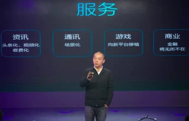 在这四大服务当中都会发生变化,第一所有资讯类的服务头条化。意味着瀑布流没完没了,跟你个人相关,千人千面。能视频化的尽量视频化。收费化,中国90后、00后起来以后,可以收很多钱;通讯,过去的通讯无论怎么改来改去都是我发给你信息,你发给我信息,下一步5到10年,通讯最大的革命在于场景化,是场景的沟通和交流;游戏当然要向新的平台转移;商业是我最不懂的,只能知道一件事情,就是金融将无处不在。在所有的产品里面,都有金融的服务。比如说你在一个电影的APP里面,可能大伙一块众筹一个电影等等等等。