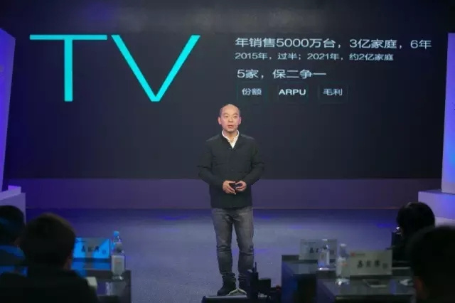 我跟大家分享电视。中国电视的生意也很简单,每年5000万台销售,中国大概有3亿家庭,一个电视大概使用期是6年时间,这是十几年不会变的。大家因为搬家、结婚又会买新的电视,6年时间淘汰。但是我再告诉大家另外一个数据,2015年大概5000万台里面,有2000万台是能联网的互联网电视,最迟到2019年80%都是互联电视。大家简单算一个数,到2021年的时候,3亿家庭里面,接近2亿都是互联网电视机,会发生什么?
