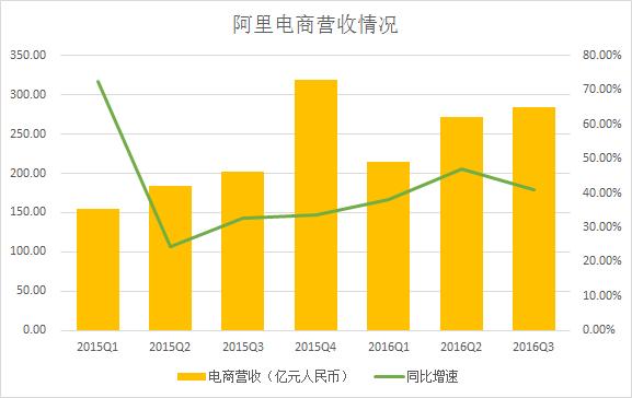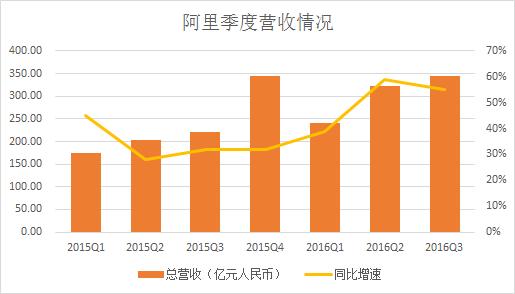 北京时间2016年11月2日晚,阿里巴巴集团公布2017财年第二季度(2016年7月1日至9月30日)财报。当季阿里集团收入达342.92亿元人民币,同比增长55%;其中核心电商业务收入为 284.93亿元人民币,同比增长41%。