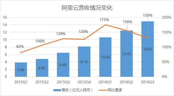 关于此前高速增长的云计算业务,阿里方面称他们已经连续第六个季度保持三位数的增速,本季度付费用户数量增长至65.1万,同比增长108%,;收入为14.93亿元,同比增长130%。