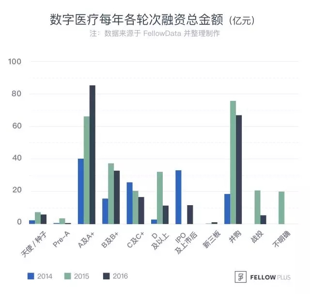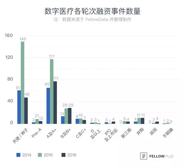 FellowData 更深入地详细统计了 2014-2016 年 Q3 数字医疗各轮次融资事件数量,明显的趋势是更多中后期项目拿到了融资(上图)。我们把天使/种子、Pre-A、A 及 A+ 轮次作为早期项目,B 轮及更后轮次作为中后期项目,统计可看出 2014 年、2015 年、2016 年前三季度的早期项目融资总数分别为 129、287、138(预计全年 184),呈现高峰后下降 趋势。但是中后期项目融资总数分别是 31、60、61(预计 2016 年全年可达 80),今年再创新高。