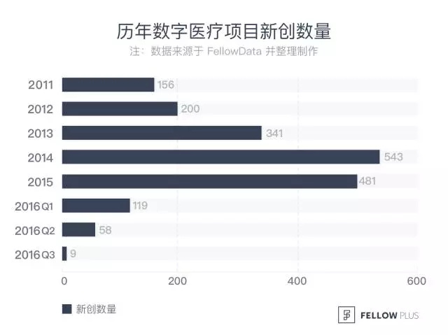 我们跟踪了 2011-2016 年 Q3 的历年数字医疗项目新创数量(上图),从 2011 年的 156 家起步,2014 和 2015 年迎来高峰,年项目新创数量达到 543 和 481 家。一时之间,上千个以互联网 + 医疗为代表的创新项目遍地开花。但到了 2016 年新创项目数量则开始难以为继,大幅下滑,前三季度只统计到 186 家,Q3 单季度更是只有个位数,显示了数字医疗领域的创新退潮。