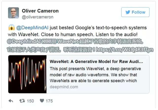 2、Deep Learning使得文字转语音系统与真人声音几乎无差异。想想这个功能能带来的可能性!