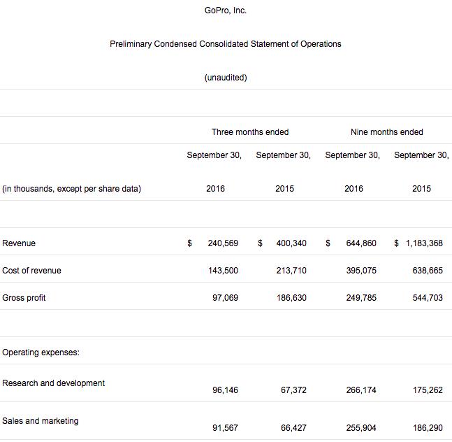 当地时间11月3日凌晨4:15,运动相机厂商GoPro(NASDAQ:GPRO)公布了截至9月30日的2016财年第三财季财报。报告显示,公司该季度营收为2.41亿美元,相比去年同期的4.00亿美元下滑40%,第三季度业绩低于华尔街分析师预期。