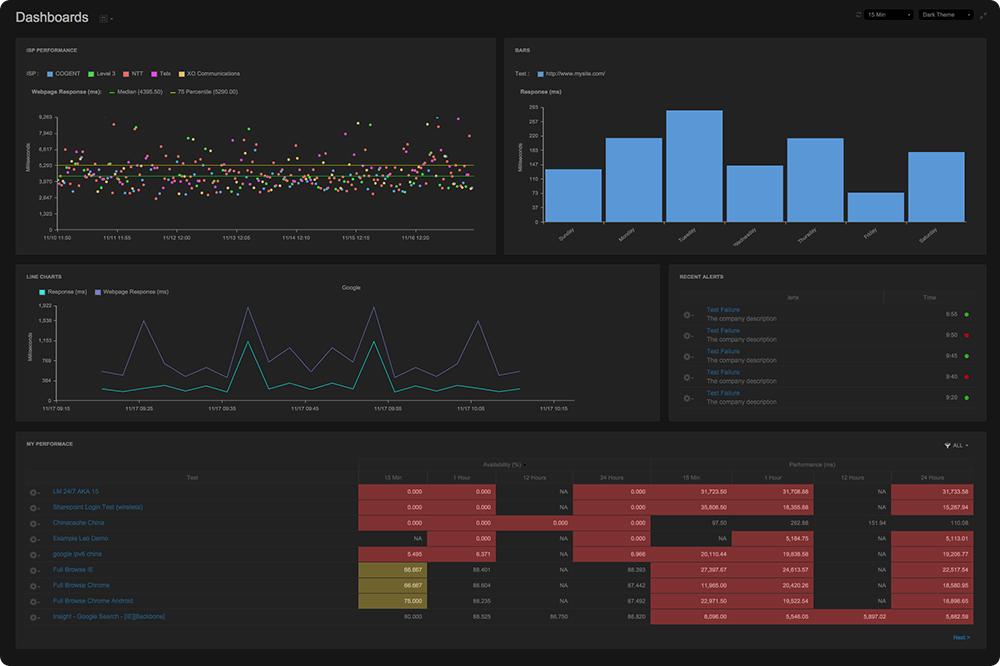 Catchpoint 可以检测 PC 端及移动端网站的性能,并根据数据提供端对端的实时分析。 具体来说,Catchpoint 的 OnPrem Agent 会根据数据库的分析总结出几个关键性的指标,比如测试网站加载速度、网页崩溃次数、交易情况等,然后将监控到的数据生成可视化的数据图,并且可以根据历史数据和企业设定的目标自动预警。企业可以选择自己需要的指标将分析图显示在 Dashboards 主页面上,从而更好的管理 SaaS 应用。