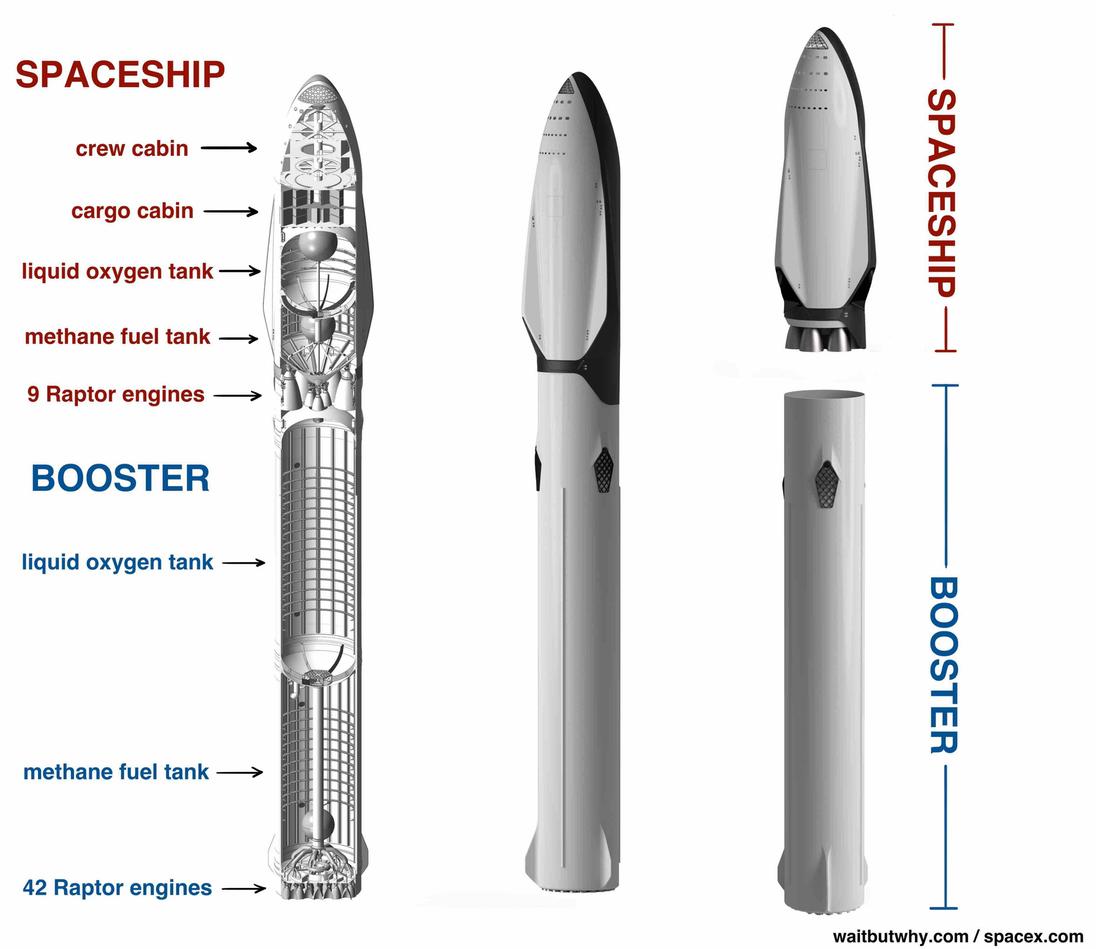 此刻需要澄清一下:我刚刚一直在说的巨型火箭事实上是由两部分组成的:一个巨型飞船安在一个巨型助推器上。