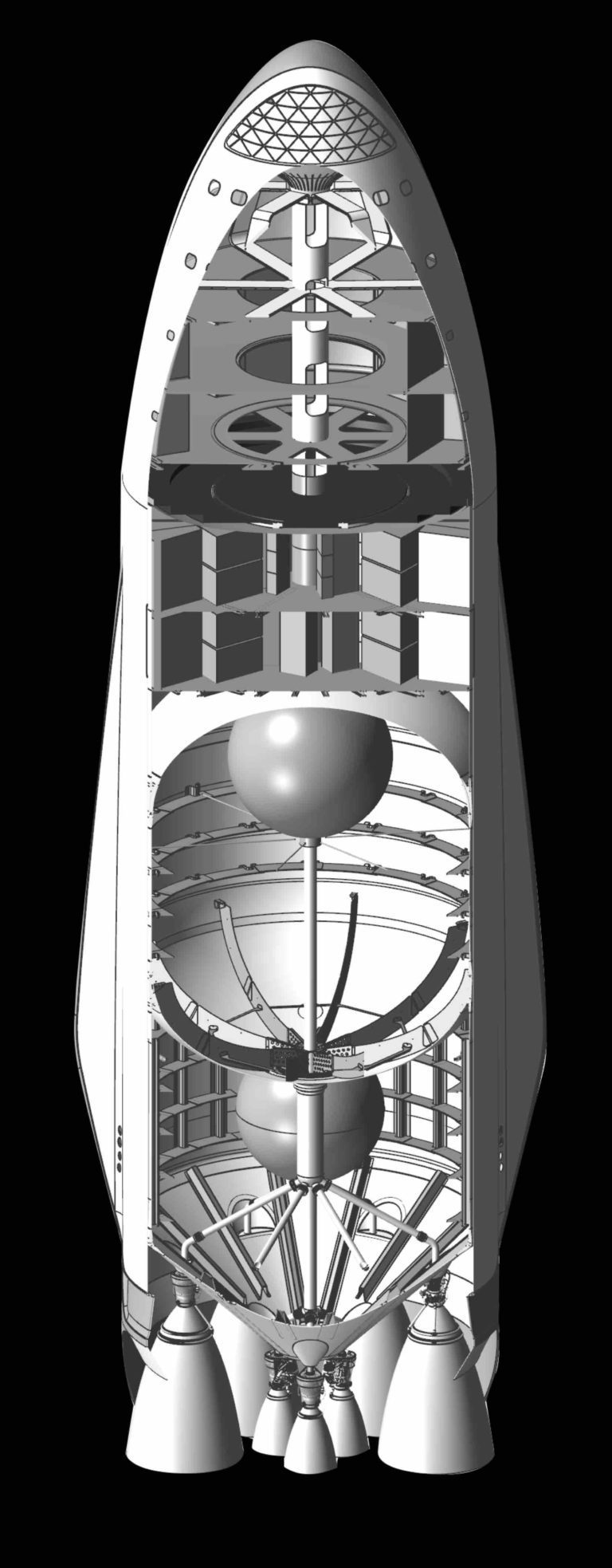 此外还有宇宙飞船——也就是SpaceX所指的星际飞船(Interplanetary Spaceship),我这里延续之前的习惯,叫它巨型飞船(Big Fucking Spaceship),这样更好玩。巨型飞船就是装在巨型助推器上面的又大又酷的东西(如果你看到这里迷糊了,提醒一下:巨型飞船加上巨型助推器就是我们一直说的巨型火箭)。巨型飞船的功能是运载人和货物抵达火星。它也将在火星上独立发射,带着想回地球的人回到地球。