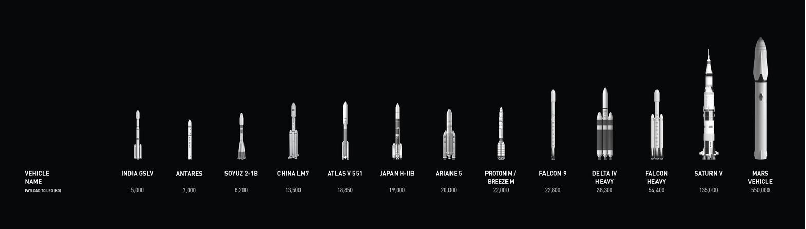 伊隆喜欢把地球到火星之旅比作横穿太平洋,如果用这个比例衡量,去月球相当于穿过英吉利海峡(去国际空间站也就是到距离海岸177英尺的码头)。继续用这个比喻的话,伊隆说,“向近地轨道或甚至月球发射的火箭基本上相当于渔船,如果跟一个要飞过1000倍远的殖民运输系统相比的话。”