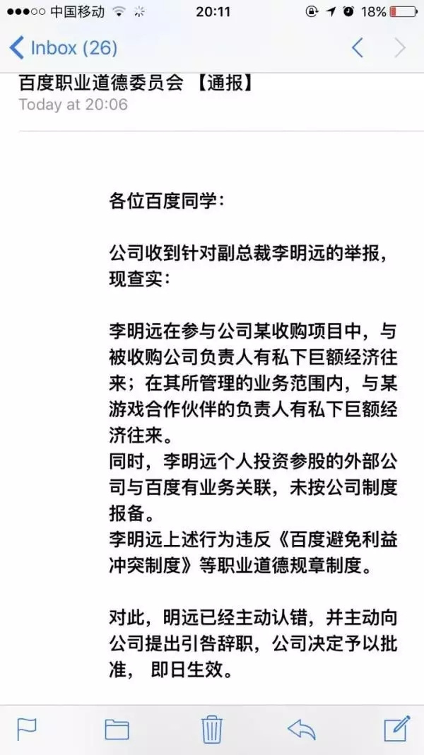 邮件中称,李明远已主动认错,并已主动向百度提出辞职。