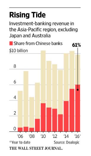据Dealogic的数据显示,在亚洲,美国银行的投行业务已经受到了中国银行业务的碾压。10年前,中资银行在亚洲(日本和澳大利亚除外)的投行业务收入份额仅为10%。而在今年,他们的份额已升到61%。相反,美国投行的市场份额从2000年以来逐步下降,由43%降至目前的14%。