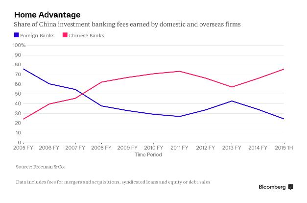 20多年来,华尔街投行一直在尝试进入中国的投行市场。摩根士丹利(Morgan Stanley, MS)和一家中国国有银行于1995年组建了中国国际金融有限公司(简称中金公司),但后来两者出现了分歧,摩根士丹利找到了新的合作伙伴,最终出售了所持股份。