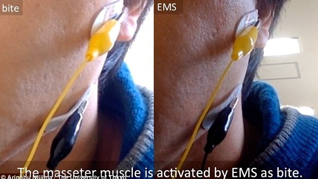 又有新的日本的研究团队在此基础上更进了一步。他们利用一排电极板对下颚的肌肉做出刺激,当人们在咀嚼食物时,通过发送100 to 250 Hz的短脉冲刺激咬肌能让虚拟食物更加具象化,富有弹性质感。团队成员透露,未来将在加强虚拟用餐体验方面推出应用。