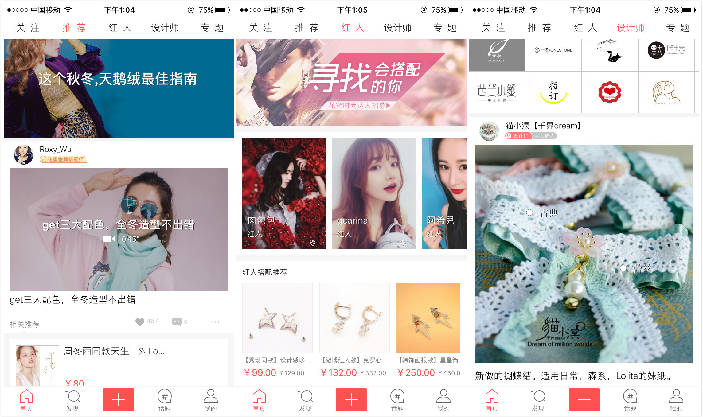 平台拥有上千位搭配师和设计师,搭配师可以让KOL更好的呈现饰品、也可以让平台的设计师作品更好地露出。团队此前尝试过自营电商,从设计师手上拿货,再发货到消费者手中。但是自营模式太过繁琐,花蜜转为导购模式,由花蜜负责前端的内容导流,商家负责后端的发货、支付环节。以时尚饰品为主,客单价在300元到1000元之间。