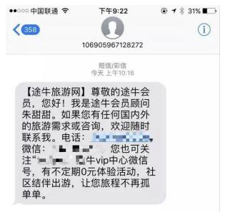 这个短信是途牛给我发的,原本我只有出去旅游才会想起途牛,现在这个导游占据了我的朋友圈,没事我就能看到她的广告了,极大提升了她和我的接触频次。这个旅游订单是我帮父母订的,我怀疑她会不会把我的父母和同团的人拉成一个群,没事的时候在群里活跃一下,促进我父母的二次消费。就这样,途牛把一个典型的低频行为利用微信,尽可能的把频次拉升了。