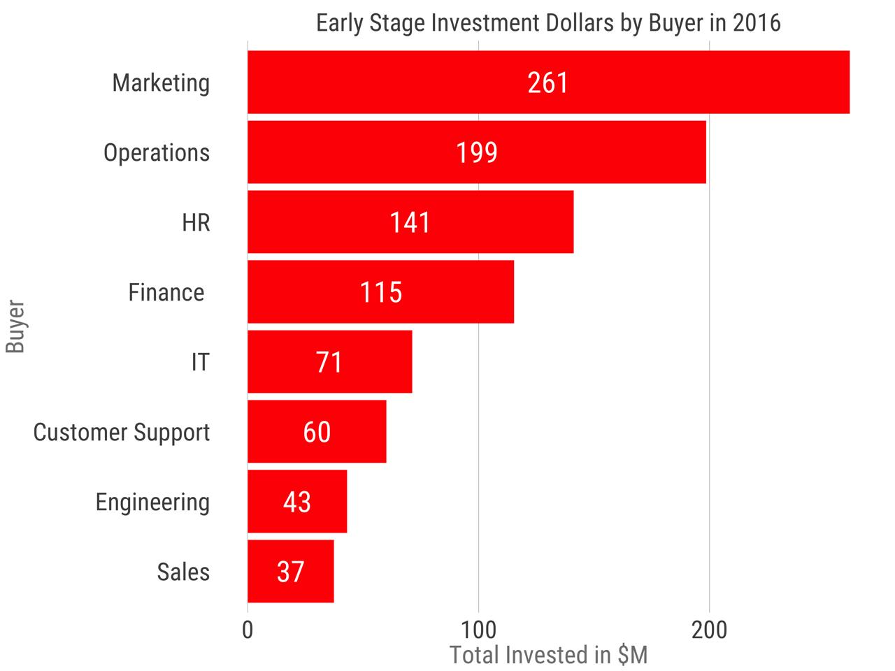 第二点是,专注于向销售类 SaaS 初创企业目前市场出现潜在饱和现象,竞争日益激烈。但与此同时,面向营销团队的 SaaS 初创企业似乎却处于蓬勃发展的势头。销售与营销所面临的竞争形势不相上下,但是营销领域在近年来进行了一系列整合,其中电邮营销公司Constant Contact在去年11月份被 Endurance International 以11亿美元收购,营销自动化软件巨头 Marketo 在 6 月份被私募股权投资公司 Vista Equity Partners 以 17.9 亿美元收购。除此之外,今年还有不少面向分析类服务的 SaaS 初创企业获得融资。