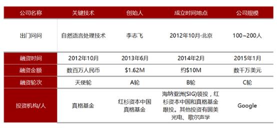 国内人工智能企业的融资状况,本篇报告选取的案例是出门问问,这家专注自然语言处理技术的初创企业,由李志飞在2012年创立,成立之初就获得真格基金的天使轮融资,之后又有红杉资本、谷歌等跟投,目前已完成C轮融资,总融资额达到7千万美元。在国内人工智能创业公司中,其融资额度仅次于融资接近2亿美元的碳云智能。