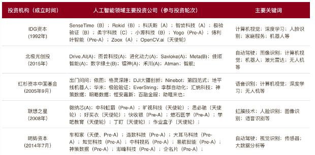 国内投资投资机构参与融资的领域遍布人工智能技术的各种应用场景,包括计算机视觉、语音识别、深度学习、AI算法、自动驾驶、无人机、智能机器人,以及各种传感器、激光雷达、计算芯片等硬件领域。