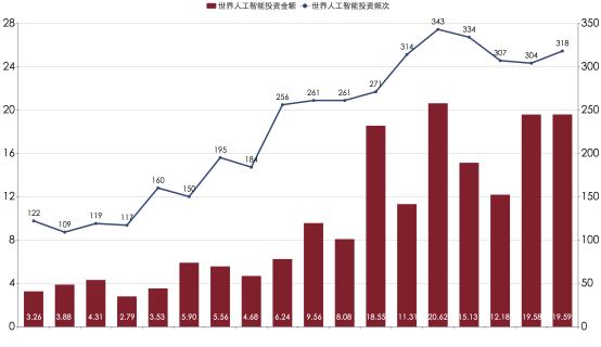 从这幅图表中可得出,最近两年来中国在人工智能领域的投资明显加快,但平均每次交易额没有明显增加。这也同第一张图表中国内人工智能企业数量和GCF在近两年增速双双放缓有着不可分割的关联。那么,人工智能的风口已经过去了吗?下面来介绍全球人工智能产业的发展与投融资状况,通过横向的比较,或许能够更清楚的解读当前中国人工智能所面临的问题。
