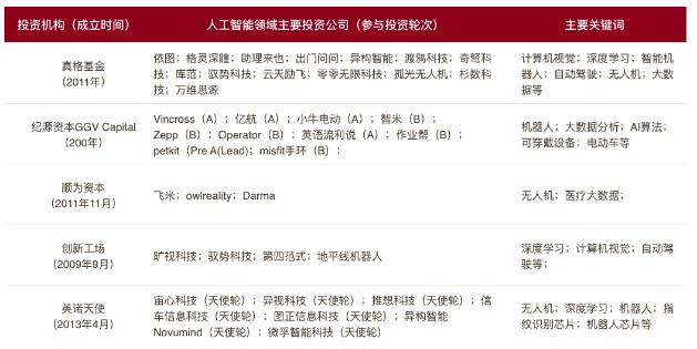 国内人工智能创业公司投融资大多与投资机构有关,从上文可看出国内科技巨头对于人工智能创业公司的融资收购力度不大,因此本篇报告列举了国内投资机构在人工智能领域的投资状况。