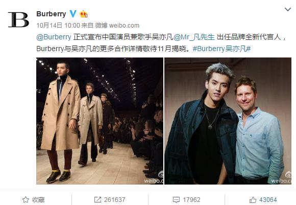 为了挽回中国市场,更加贴近中国年轻人,Burberry于10月14日在其官方微博宣布吴亦凡出任其品牌代言人,成为该品牌第一位非英裔代言人。