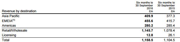 分地区来看,尽管中国大陆在第二季度有个位数百分比的增长,但整个亚太地区中期业绩仍旧是小幅度下跌。其中香港地区下降幅度最大,达到两位数的百分比。在业绩报告中,Burberry还是乐观地表示,除香港澳门外,亚太地区整体的趋势是向好的。
