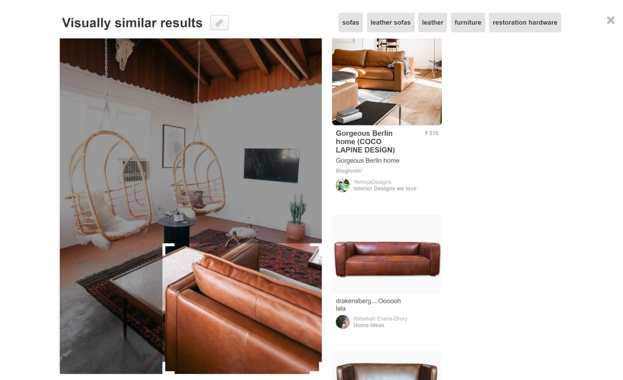 Pinterest 在视觉搜索中使用这种技术的做法引人注目。用户可以通过点击每张图片右上角的放大镜来调整图像上叠加的矩形框的大小和位置。然后软件就可以找到与矩形中的的画面相似的东西。