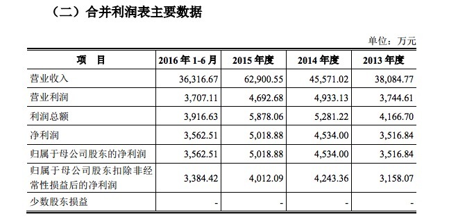 归属于母公司股东的净利润分别为3,516.84万元、4,534.00万元、5,018.88 万元、3,562.51万元,2013-2015年的复合增长率为19.46%。