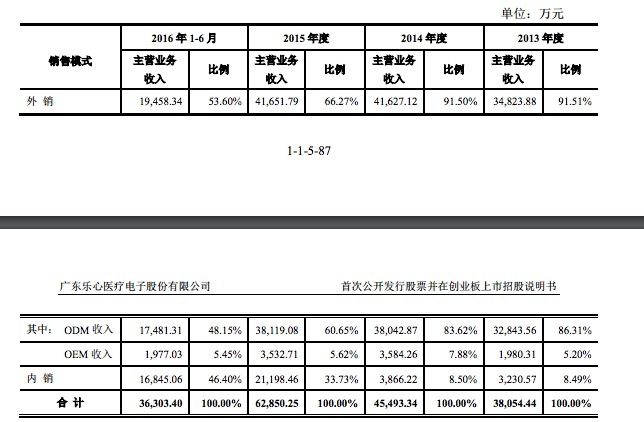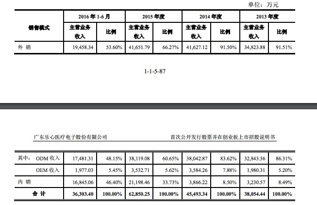 从招股书的数据来看,外销收入是公司主要的收入来源。报告期内,乐心外销收入从 2013年的34,823.88万元增至2015年的41,651.79万元,年均复合增长率为9.36%。 外销中,公司主要以 ODM 模式进行销售,ODM 销售收入占比较大。