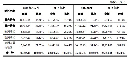 最近三年,公司内销收入从 3,230.57 万元增长到了 21,198.46 万元,占主营业务收入比重也由 8.49%提升至 33.73%,2016 年 1-6 月,内销占主营业务收入比重提升至 46.40%,但是仍以海外为主。