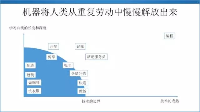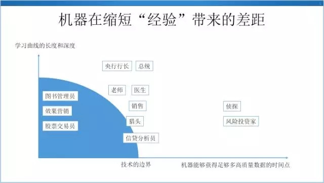 当机器开始可以积累经验,把大量的样本作为经验沉淀下来,沉淀到自己的神经元网络里面,就有可能提升该领域没有经验的从业者的工作效率,或者干脆替代这些人,趋势就是让有经验的人和没有经验的人之间的差距越来越小。现在有一些行业的人力已经被替代了,现在 99% 的股票交易的指令都不是人下的,是机器下的。