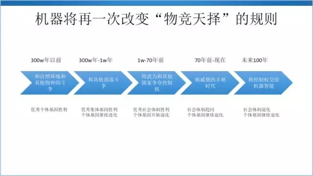 我最后分享一个还不是很成熟的观点。就是这个机器智能有可能再次,或者最后一次改变物竞天择的规则。
