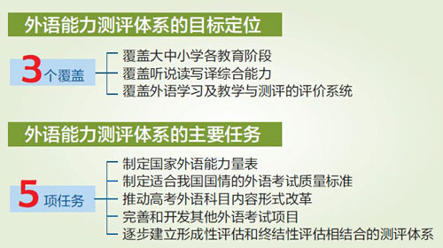 2014 年 9 月,国务院发布了《关于深化考试招生制度改革的实施意见》的文章,明确要从改进招生计划分配方式、改革考试形式和内容、改革招生录取机制等几个方面入手,到 2020 年为止基本建立中国特色现代教育考试招生制度。关于外语能力测评体系方面的建设,则是: