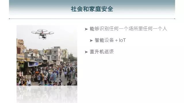 智能化的社会和城市,不仅仅是交通,比如现在大家非常关心安全。有一个办法说可以用很多无人机来代替警察巡逻,现在的无人机无非拍一些航拍照片,而将来,它的视觉芯片能够是别人或者其他目标,甚至是危险品。