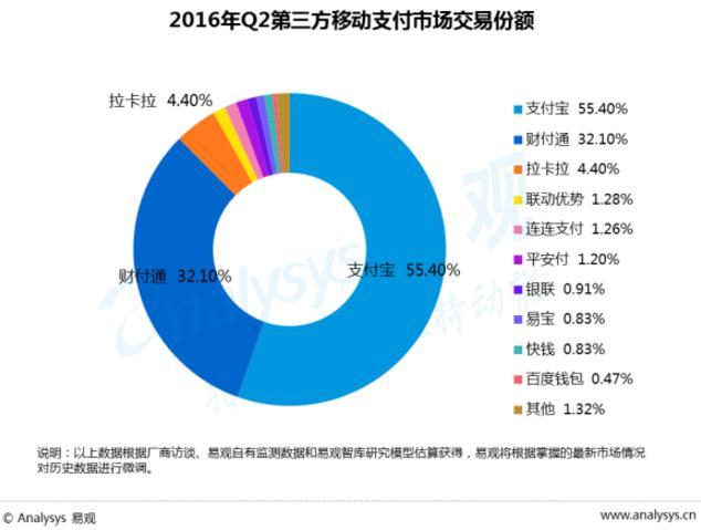 据易观Analysys数据,2016年上半年第三方互联网支付交易总规模达到90148亿元。其中,第二季度交易规模为46500亿元,环比增长6.5%。从互联网支付市场格局来看,支付宝以43.39%占比排在第一,财付通以16.95%的占比排在第二位。