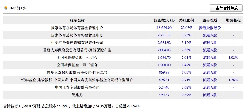 截至2016年第三季度,中体股份十大股东组成。(图片来源:和讯网)