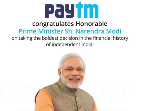 据金融时报报道,莫迪政府推出“废钞”决定没几天,就被印度最大移动支付和商务平台Paytm“利用”了。Paytm在印度多家主流媒体上打了整版广告,并写到“祝贺尊敬的总理纳伦德拉•莫迪(Narendra Modi)先生做出了印度独立以来的金融史上最大胆的决定!”。