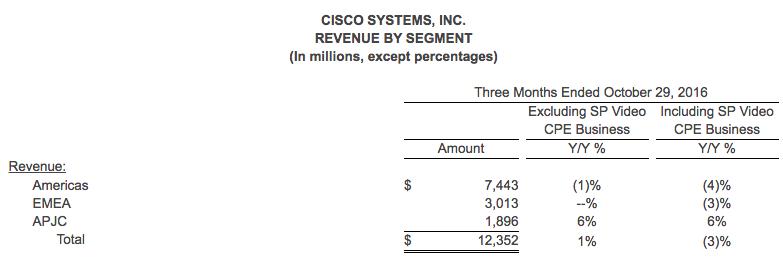 不包括SP Video CPE业务,自于美洲地区的营收同比下滑1%,上个季度同比增长3%;来自于EMEA地区的营收同比持平,上个季度同比增长3%;来自于APJC地区的营收同比增长6%,上个季度同比下滑2%。